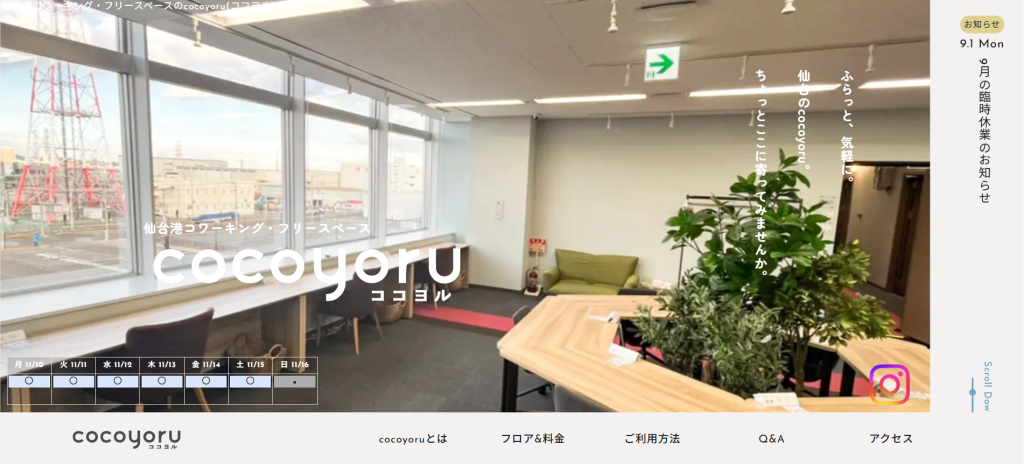 フリーランスやリモートワーカーはもちろん、自習や副業の拠点としても人気。商業施設やカフェも近く、仙台中心部で快適に働けるワークスペースを探している人におすすめです。