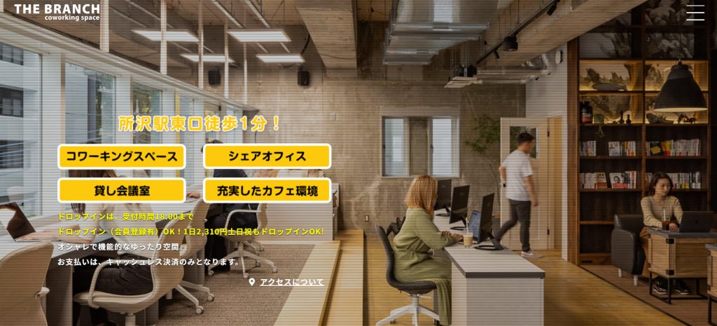 所沢駅東口から徒歩1分の好立地にあるTHE BRANCH は、「仕事と恋するコワーキングスペース」をテーマに掲げた施設です。駅近ながら落ち着いたゆとりあるレイアウトで、仕事や勉強、ミーティングなど様々な用途に対応できる快適な場を提供しています。