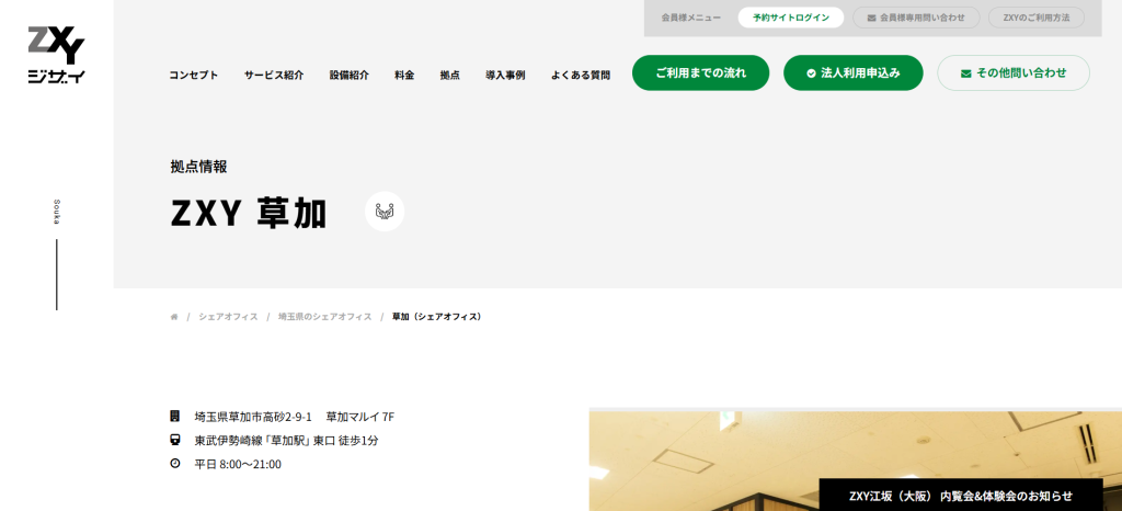 ZXY 草加は、埼玉県草加市・草加マルイの7階に位置する個室中心のサテライトオフィス兼シェアオフィスです。東武伊勢崎線「草加駅」東口から徒歩1分という駅近の好立地で、通勤や外出の合間にサクッと立ち寄るのにも便利でしょう。