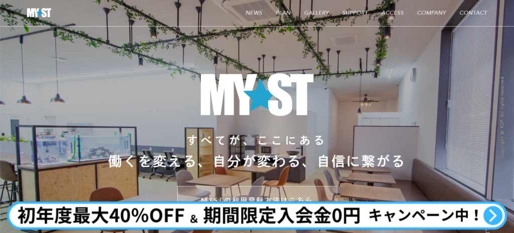 MYSTは川口市にある多機能型ワークスペースで、JR川口駅から徒歩約8分とアクセスも良好です。白を基調とし天井が高く取られた開放的な空間が印象的で、「新しい私(SELF)」をテーマに、7 つの “ST” コンセプトを掲げています。