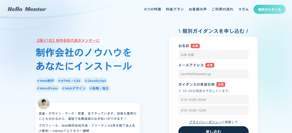 Hello Mentorは、制作会社を経営する代表や現役プロから、Web制作の実務ノウハウを直接学べるメンタリングサービスです。単に質問に答えるだけでなく、目標達成に向けて「次に何をすべきか」を提示してくれる主導型のサポートが特徴で、独学やスクール卒業後の次の一歩に迷っている方に最適です。