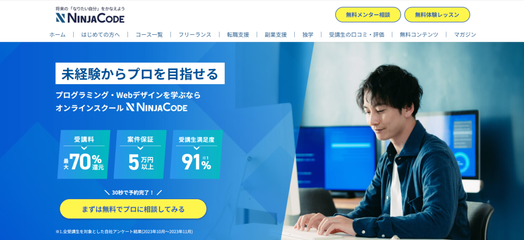 忍者CODEは、未経験からの学習だけでなく、現場に出た後のサポートまで徹底しているオンラインスクールです。現役のエンジニアがメンターとして伴走してくれるため、実務を想定したプロジェクト形式の課題を通じて、判断力の高いエンジニアを目指せます。