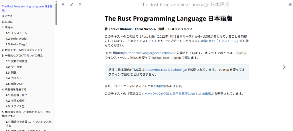 Rustの正統派入門書として知られる「The Book」は、初学者が環境構築から変数、関数、所有権、借用まで順を追って学べる構成になっています。