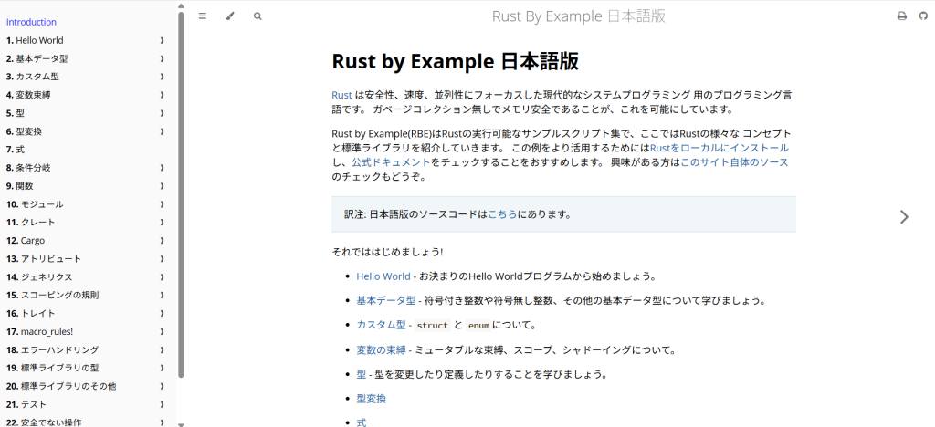 「Rust by Example」は、コード例を通じてRustの動作を実際に体感しながら学べるドキュメントです。Hello Worldの基本から始まり、イテレータ、クロージャ、エラー処理、並行処理まで幅広くカバーされています。