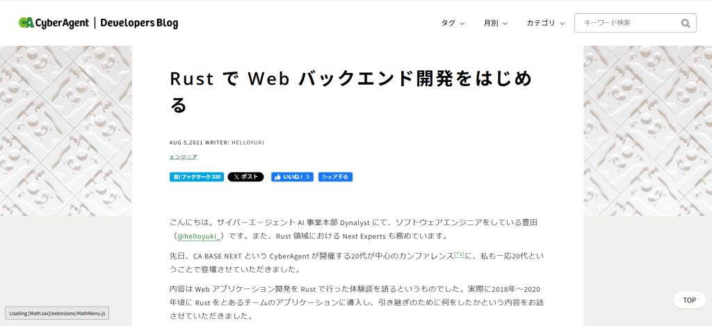サイバーエージェントの事例では、2018年から2020年にかけてあるチームのアプリケーションにRustを導入した経験が紹介されています。