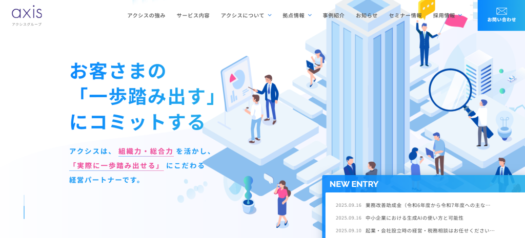 税理士法人アクシスは、会計・税務だけでなく、労務や行政手続、事業承継や相続対策まで幅広くサポートする総合経営サービス業を展開する税理士法人です。
