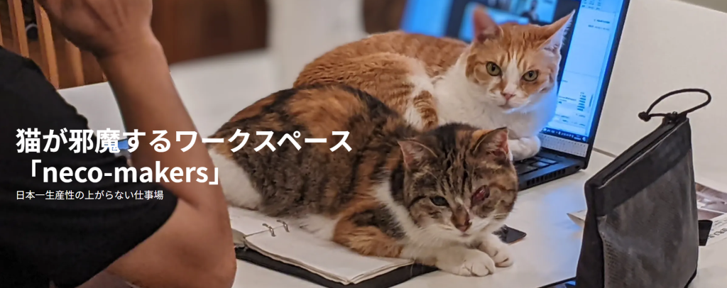 SANCHACOが運営する「neco-makers」は、保護猫が常駐する“猫が積極的に邪魔する”ワークスペース。集中して効率を追求する環境とは真逆で、猫たちとの触れ合いがリモート会議を和ませたり、雑談や発想のきっかけにつながるのが魅力です。