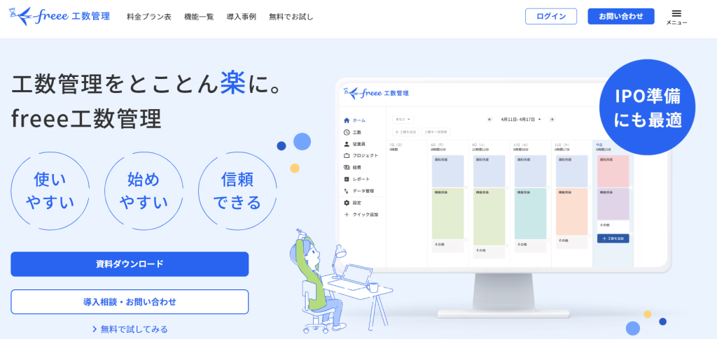 freee工数管理は、フリー株式会社が提供する工数・収支の可視化に特化したクラウドサービスです。日々の工数入力から集計、プロジェクト別の人件費原価の算出までを一貫して扱える設計で、集計作業の手戻りを抑えられます。