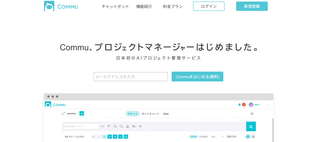 Commuは、AIチャットボットによる進捗サポートを特徴とするプロジェクト管理サービスです。タスクをチケットとして整理し、担当者や期限と紐づけて管理できるため、チーム内の情報共有と作業状況の把握がスムーズに進みます。