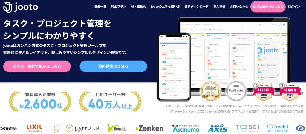 Jootoは、株式会社PR TIMESが提供するクラウド型のタスク・プロジェクト管理ツールです。カンバン方式による直感的な操作性と、ガントチャートや横断管理などの進捗可視化機能を備えています。タスクに担当者や期限、ラベルを設定できるため、複数人での業務進行をスムーズに共有可能です。