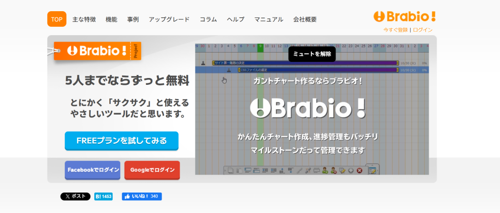Brabio!は、ブラビオ株式会社が提供する国産のクラウド型プロジェクト管理ツールです。最大の特徴は、ガントチャートを「エクセルの10倍速く」直感的に作成できる軽快な操作性。マウス操作だけでタスクを追加・移動でき、初心者でもすぐにスケジュール表を作れます。