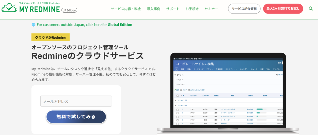 My Redmineは、ファーエンドテクノロジー株式会社が提供する、オープンソースのプロジェクト管理ツール「Redmine」をクラウドで利用できるサービスです。タスクをチケットとして登録し、担当者・期日・ステータスを共有することで、チーム全体の進捗を可視化できます。