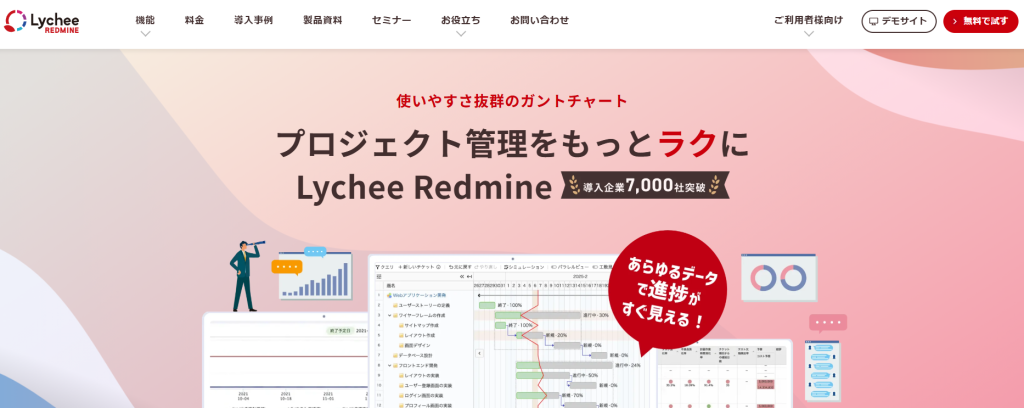 Lychee Redmineは、株式会社アジャイルウェアが提供するRedmine(オープンソース)ベースのプロジェクト管理サービスです。点在する管理ファイルや進捗を一元化し、プロジェクトの状況をリアルタイムに把握できます。