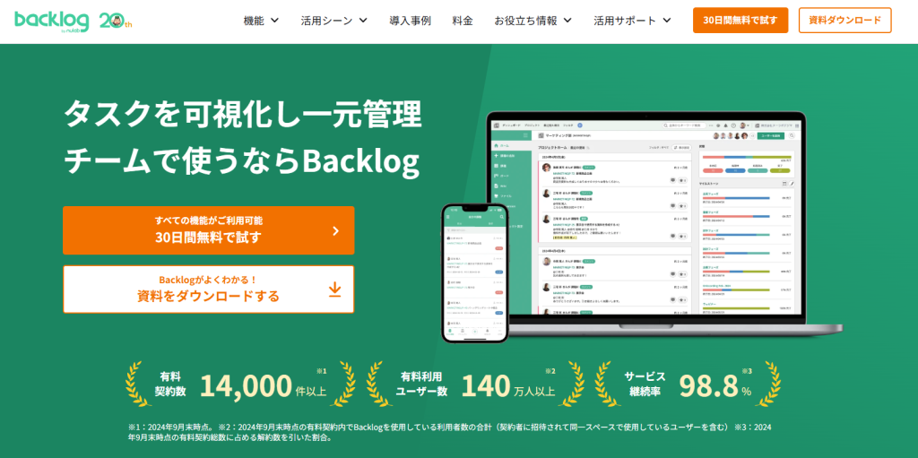 Backlogは、株式会社ヌーラボが提供するチーム向けのプロジェクト/タスク管理ツールです。課題をオンラインで一元管理し、誰が何をいつまでに進めているかを把握しやすい設計です。