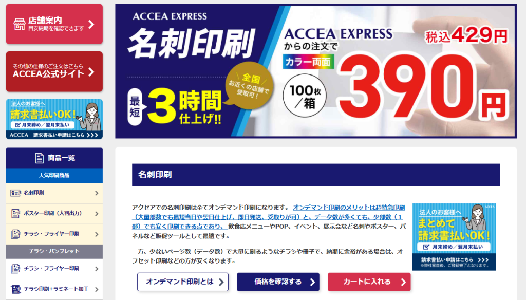 「アクセア」は名刺のオンデマンド印刷サービスです。特急印刷、大量部数に対応していることが最大の特徴。特急料金がかからず、店頭かつ1,000枚までであれば最短3時間後に受け取ることができます。