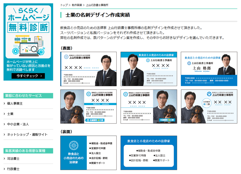 行政書士の名刺デザインを具体的に掲載している記事です。提案した複数のサンプルを載せたうえで、実際の決定稿も紹介しています。具体的な名刺のイメージを持つことができます。