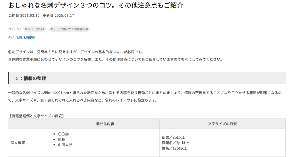 そのうえで名刺に載せるべき情報・項目、載せた方が良い情報・項目など丁寧な解説をしています。信頼されるデザインのポイントでは、同業者との名刺の差別化要素にまで言及しています。