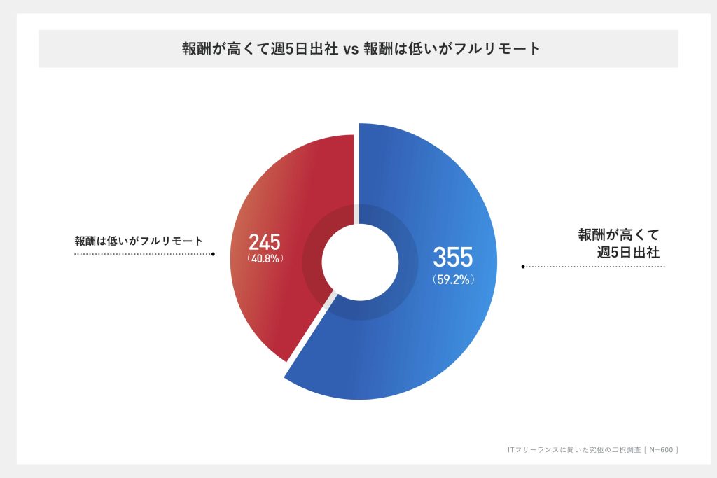 この条件では、「高報酬で出社」を選ぶ人が約6割を占め、差が付きました。出社かフルリモートかの判断に関しては、環境以上に、報酬条件が大きく影響していることが分かります。