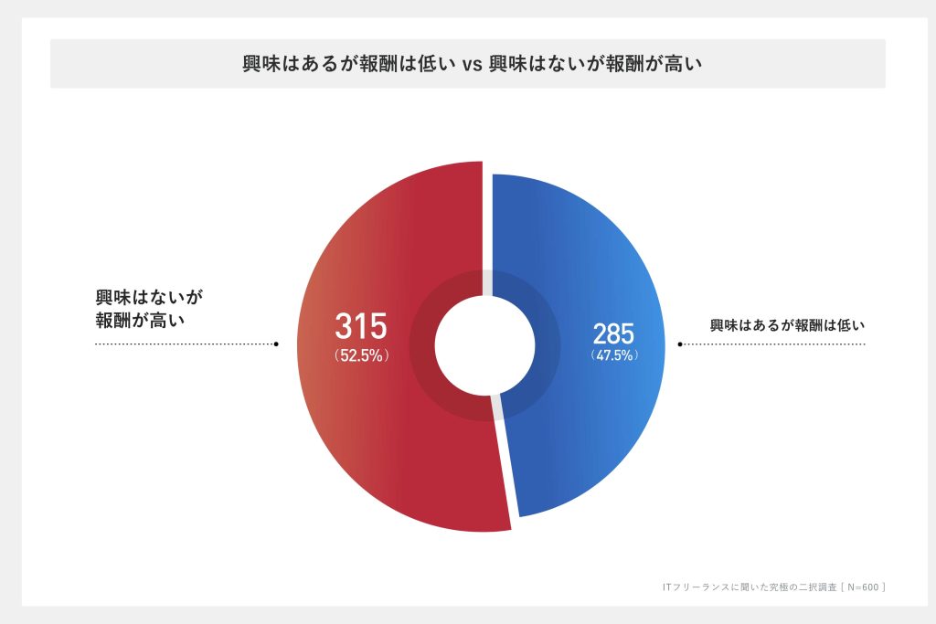 二択で訪ねたところ、「興味はないが報酬が高い仕事」、「レガシー案件だが報酬が高い仕事」と、それぞれ報酬が高い方を選ぶ人が過半数を占めました。